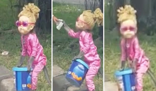 The monkey was spotted wearing a giant female doll mask complete with pony-tailed blonde hair and sunglasses. He held a blue bucket to collect money, the monkey stood and looked around at the drivers, waiting for anyone who might be willing to give him some change he would then approach the person and collect the money.