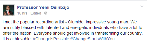 Muhammed Buhari’s running mate in the upcoming 2015 presidential elections under APC, Prof. Yemi Osinbajo was at the Olamide Live In Concert (OLIC) which held on Sunday December 28, 2014. He took to his facebook page to talk about his experience with the popular rap artiste….