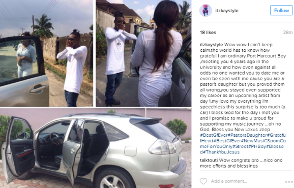 An upcoming Port Harcourt based artiste, Kay Style took to his Instagram to show off the Lexus SUV his girlfriend of 4 years bought for him. You go, girl! Though, it looks more like a publicity stunt to me…
