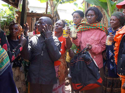 Members of Destiny of King’eero Women’s Group, formed to monitor drinking joints in King’eero township, found the four men drinking at the home of a suspected chang’aa seller. The men fled to a nearby maize plantation following the ambush at the home of 50-year old Franco Okori.(pictured being questioned by the women)