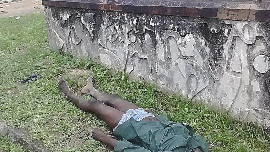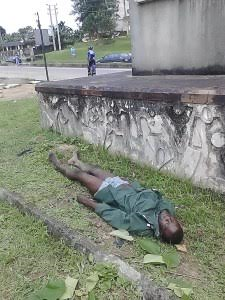 “He is properly resting and there are no visible struggle signs on the right pillar at the Calabar gate where he is lying, suggesting that the attack on the victim took place there. He is sporting a flowery brief on a green work coat, while his legs show signs of having walked through a muddy area. There is a depression on the right side of his skull that I suspect was a blow dealt to his head…maybe the injury that killed him. Nobody around the area is volunteering any information but someone that l was able to speak with thinks this is another cult related killing; he doesn’t appear convincing,” the source told CaliTown correspondent