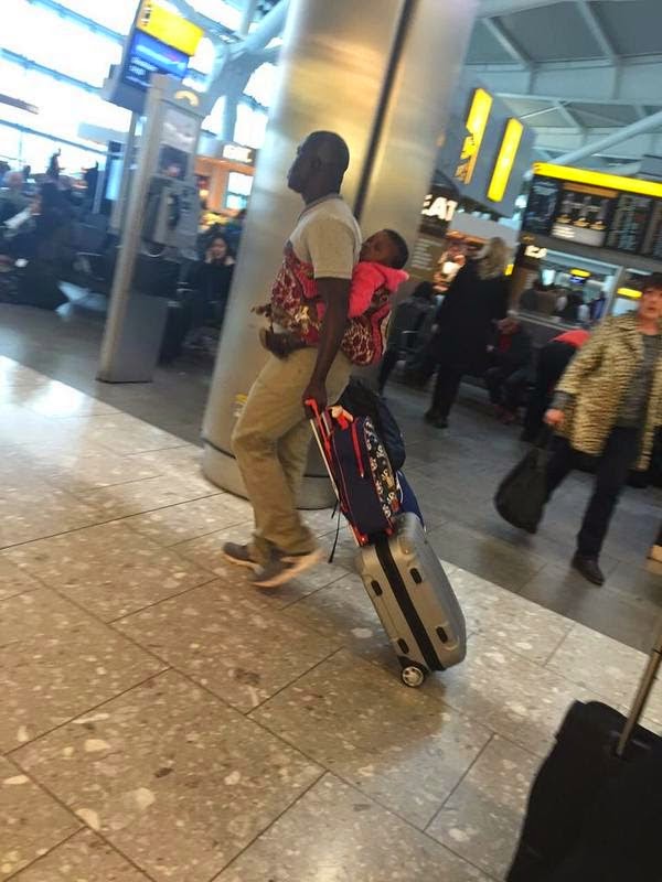 • Photos: Man Tied His Baby To His Back At Heathrow Airport