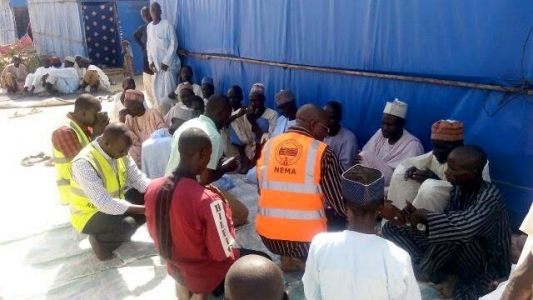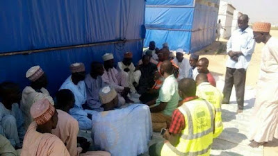 NEMA/SEMA camp managers are pictured condoling with bereaved families affected by suicide bomb blast which occurred at a coffee drinking spot near the gate of Bakassi IDP camp in Maiduguri Borno State.