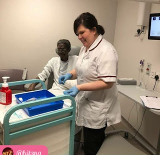 Veteran actor Sadiq Daba who was out of the country some weeks ago due to his sickness has been pictured with the doctors and nurses taking care of him in the United Kingdom.