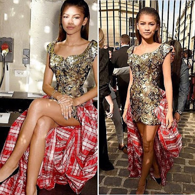 For one to be a trend setter in this generation, one has to be a fashion forward initiator (sort of). Well, 19 year-old American singer, Zendaya was spotted at Paris Fashion Week rocking a Vivieene Westwood dress with Ghana-Must-Go material attached to it. Creativity!
