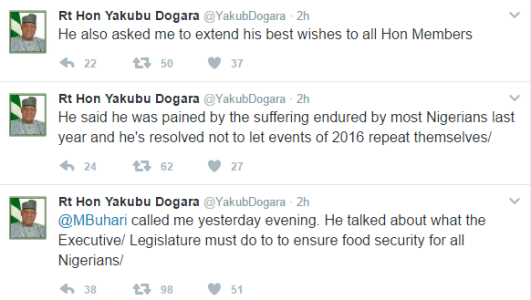 Speaker House of Representatives, Hon. Yakubu Dogara in a series of tweets revealed that President Buhari called him yesterday evening to discuss what the Legislative and Executive arms of government need to do ensure food security in Nigeria. Meanwhile, see Nigerian twitter users reactions to the tweets after the cut..
