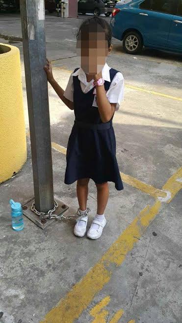 A cruel mum chained her young daughter to a street lamp post as punishment for playing truant from school. The photo shows the tearful eight-year-old child with a metal chain hooked around her ankle and tied to a large metal post. The youngster covered her mouth and looked on with a sad expression after being left there by her raging mother.