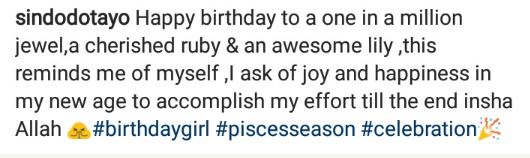 Sindodo shared the picture of herself online with the caption, “Happy birthday to a one in a million jewel, a cherished ruby and an awesome lil, this reminds me of myself, I ask of joy and happiness in my new age to accomplish my effort till the end insha Allah”