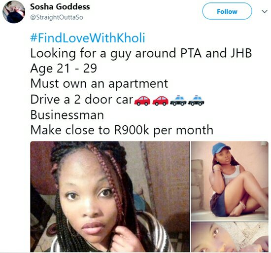 South African based female Twitter user identified as Sosha Goddess (@StraightOuttaSo), has set the social media buzzing with comments and mixed reactions after she revealed her requirements in a perfect man she is currently searching for.