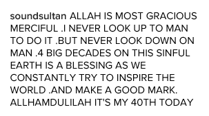 ALLAH IS MOST GRACIOUS MERCIFUL .I NEVER LOOK UP TO MAN TO DO IT .BUT NEVER LOOK DOWN ON MAN .4 BIG DECADES ON THIS SINFUL EARTH IS A BLESSING AS WE CONSTANTLY TRY TO INSPIRE THE WORLD .AND MAKE A GOOD MARK. ALLHAMDULILAH IT’S MY 40TH TODAY.