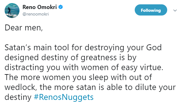 “The more women you sleep with… the more Satan is able to dilute your destiny” – Reno Omokri