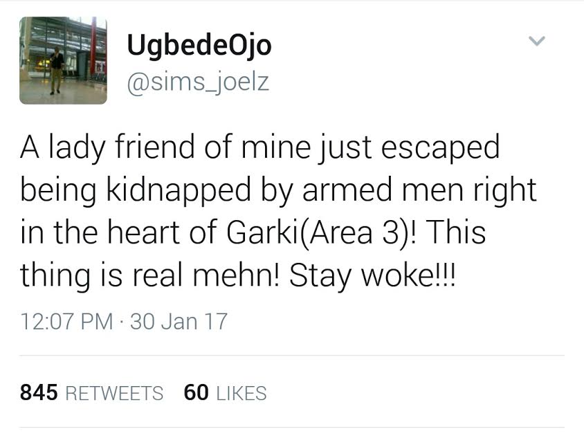 Two young ladies and a man are currently missing in Abuja and have not yet been found. This is among other recent cases. Now a twitter user has narrated how a lady was almost kidnapped today in broad daylight. The appropriate authorities definitely need to address this and intervene immediately.