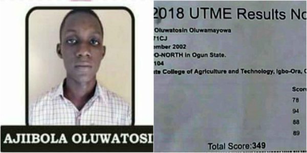 “Ajibola Oluwatosin from Egbado North, Ogun State recorded 78 in the Use of English, 94 in Mathematics, 88 in Physics and 89 in Chemistry. Giving a total of 349.”