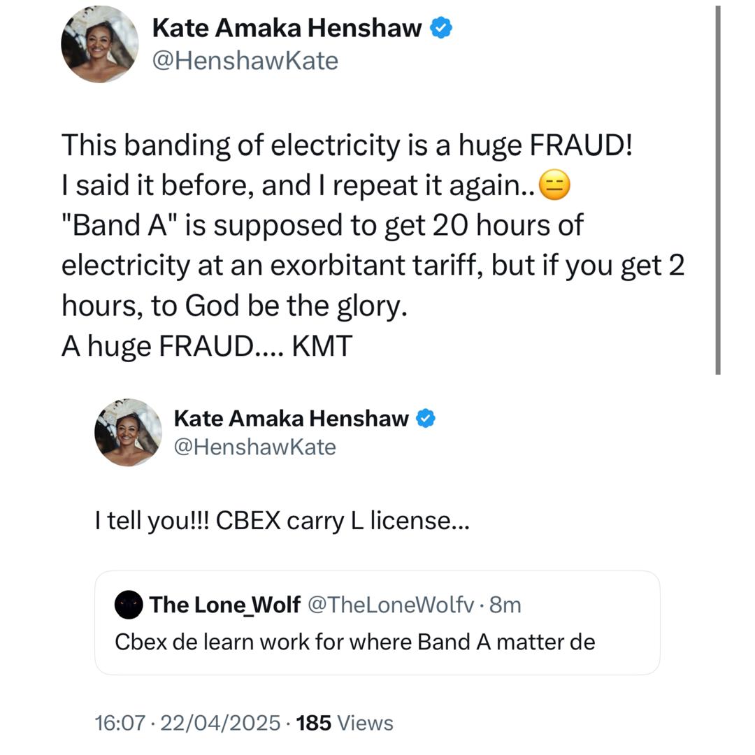 Actress Kate Henshaw has criticized electricity supply in bands.
