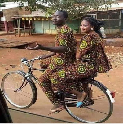 Awww… True love is not all about material things biko. The happy wife was grinning from ear to ear as she rode on a bicycle with her hubby in a uniform outfit.