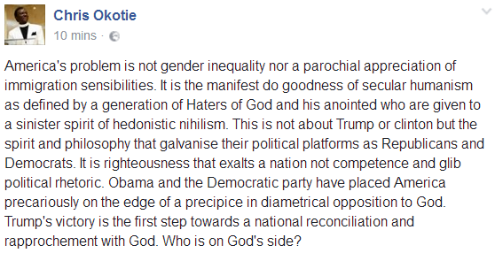 Popular Lagos pastor, Chris Okotie, shared his thoughts on the upcoming US general election holding next month. According to Okotie, Donald Trump’s victory will be the first step towards a national reconciliation and rapprochement with God.