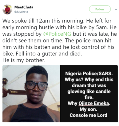 “‘We spoke till 12am this morning. He left for early morning hustle with his bike by 5am. He was stopped by @PoliceNG but it was late, he didn’t see them on time. The police man hit him with his batten and he lost control of his bike. Fell into a gutter and died. He is my brother”