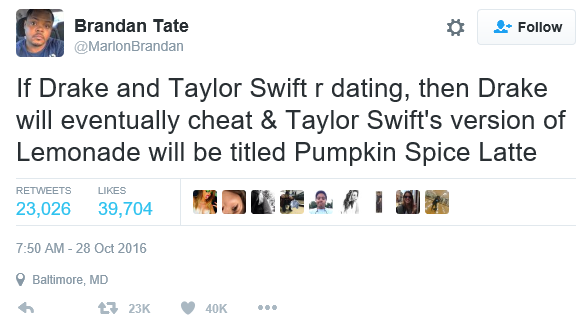 Twitter user’s reaction to the rumour that Taylor Swift and Drake are dating