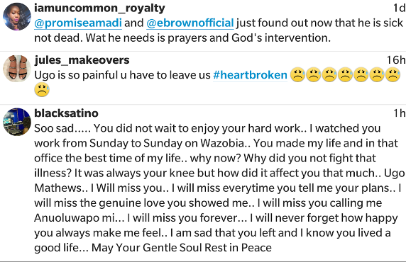 Upcoming comedian and producer at Wazobia TV, Franklyn Ugo Matthews, has died. The cause of his death is not yet known but his friends and colleagues like Alibaba have taken to social media to mourn him.