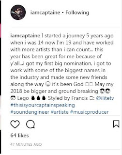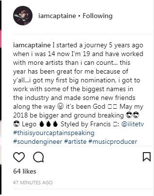 “I started a journey 5 years ago when i was 14 now I’m 19 and have worked with more artists than i can count… this year has been great for me because of y’all…i got my first big nomination, i got to work with some of the biggest names in the industry and made some new friends along the way it’s been God May my 2018 be bigger and ground breaking Lego