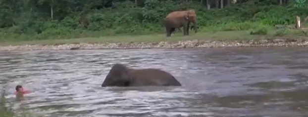 The Save Elephant Foundation in Thailand captured video of a concerned baby elephant at Thailand’s Elephant Nature Park rushing to the aid of volunteer, Darrick Thomson who appeared to be drowning. Thomson was actually in control of the situation but the young elephant named Kham Lha was taking no chances. She rushed into the water to rescue her friend with whom she had formed a strong bond. See more photos and the video after the cut.