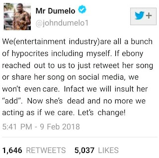 He said this in the wake of the death of Ghanaian dancehall rapper, Ebony Reigns in a tragic auto crash last week.