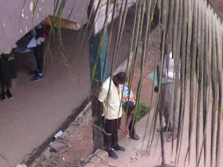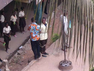The photos show a school with some students dressed in their uniforms standing outside the building and observing a punishment being meted out on their colleague.