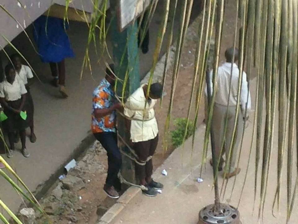 One of the students, who was being punished, is seen being tied up to a pillar by a man said to be a teacher in front of the school and the other students who were looking bewildered by the development.