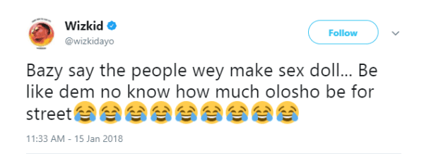 Wizkid who has already been let in on the news, took to twitter to speak on the sex doll.