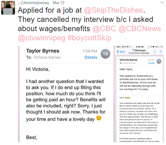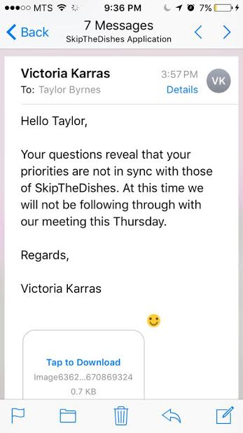 “Your questions reveal that your priorities are not in sync with SkipTheDishes. At this time we will not be following through with our meeting this Thursday.”