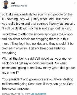 “So I take responsibility for scamming people on the TL. Nothing I say will justify what i did. But mans was really broke and that seemed like my last resort. I’ll still be dealt with so this is not a get out jail card,” he tweeted.