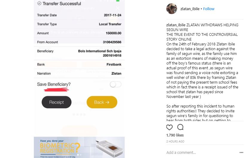 On the 24th of February 2018 Zlatan Ibile decided to take a legal action against the family of segun wire, as the family use him as an extortion means of making money off the boy’s famous status (there is an actual proof of this event ,as segun wire was found sending a voice note extorting a well wisher of 85k there by framing Zlatan of not paying the present term school fees which in fact there is a receipt issued of the school that zlatan has payed since November last year )
